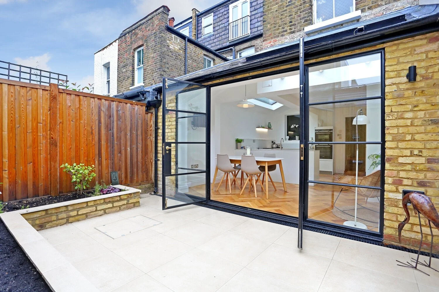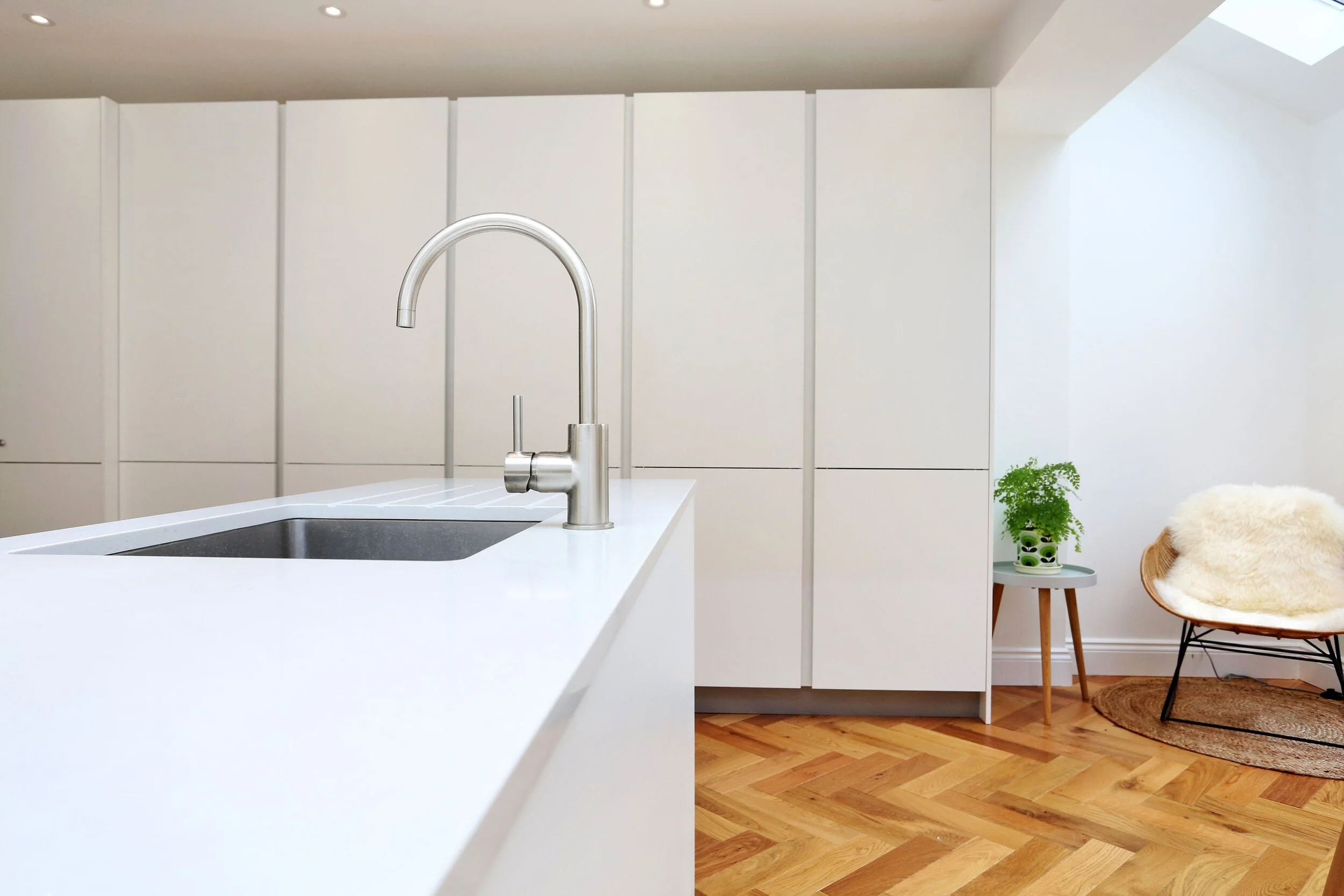 London. Clean, bright and ultra minimal, we designed an Arctic White handleless Pronorm Y-line kitchen complete with integrated Siemens appliances in chrome finishes to flood this compact space with light. Contrasting against the warm wood herringbone flooring, the finish was effortlessly slick and functional.